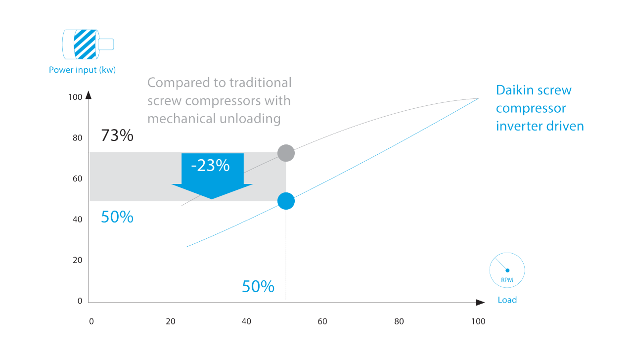 Привод Daikin VFD позволяет блоку работать оптимально, снижая и ставя под контроль эксплуатационные расходы в любых рабочих условиях. Фирменный одновинтовой компрессор интегрирован с системой переменной объемной производительности (VVR), которая изменяет степень сжатия, повышая эффективность компрессора при изменении условий окружающей среды.