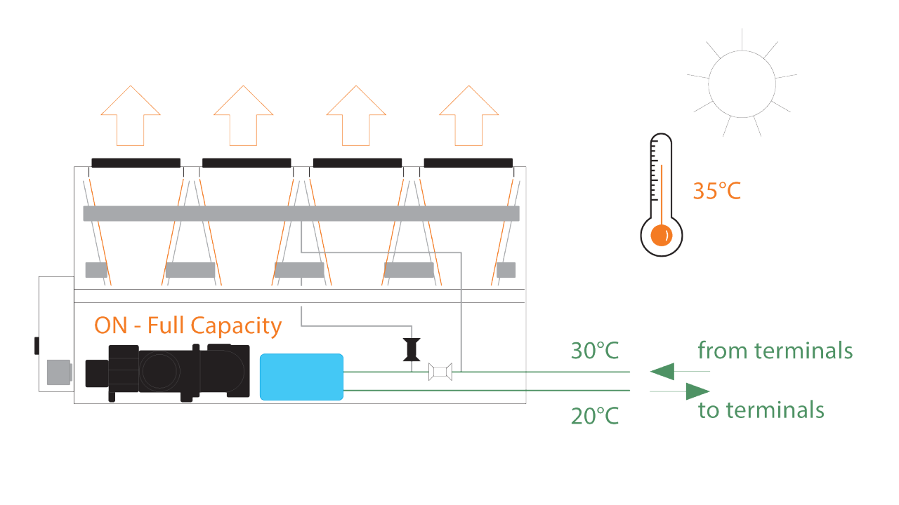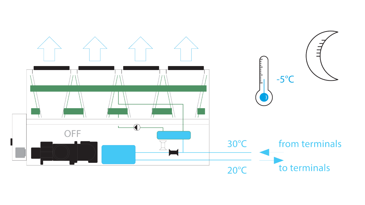 Система естественного охлаждения предназначена для охлаждения жидкости путем использования холода из окружающей среды. Когда температура наружного воздуха выше температуры жидкости, блок обеспечивает холодопроизводительность, используя только компрессоры (режим механического охлаждения). Когда температура окружающей среды опускается ниже температуры жидкости, поступающей в блок, наружный воздух может использоваться для охлаждения жидкости до того, как она достигнет испарителя, переходя от частичного к полностью естественному охлаждению в зависимости от изменения температуры окружающей среды.