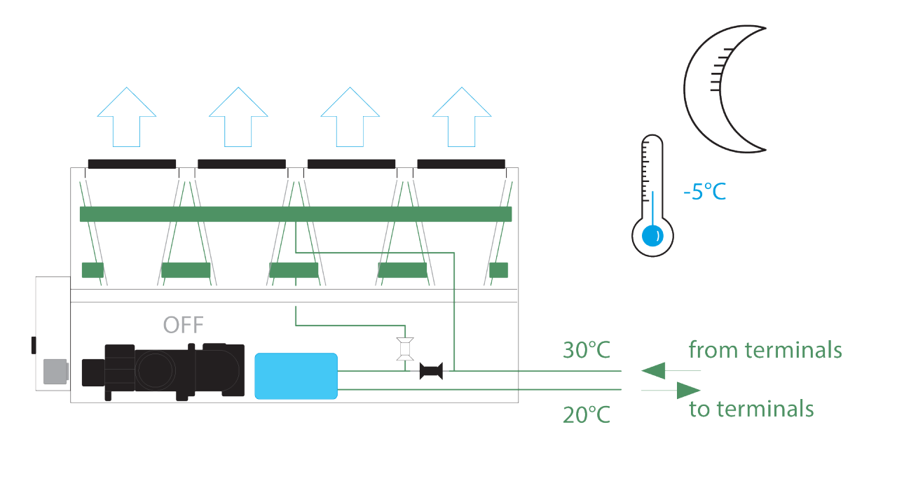 Пластинчатый паяный теплообменник блока образует замкнутый контур с теплообменником естественного охлаждения и специальным насосом. В этой системе гликоль заключен в замкнутом контуре. Вариант без гликоля работает по принципу «замкнутого контура», обеспечивая соответствующее требованиям и эффективное решение для случаев, когда предпочтительно избегать использования гликоля. Одним из преимуществ является возможность значительной экономии средств, поскольку отказ от гликоля в системе заказчика упрощает ее техобслуживание и повышает общую эффективность. В промышленных процессах это снижает риск загрязнения, гарантируя, что качество продукции не пострадает.